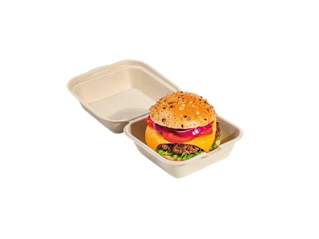Tato čtvercová nádoba ve tvaru „hamburger box“ vyrobená z rákosové buničiny je ideálním řešením pro restaurace s jídlem s sebou. Díky své velikosti a tvaru je ideální pro balení burgerů, sendvičů, porcí hranolků, ale i menších obědů a cukrovinek (např. koblih, sušenek). Její estetický design zdůrazňuje přirozený charakter podávaného jídla.