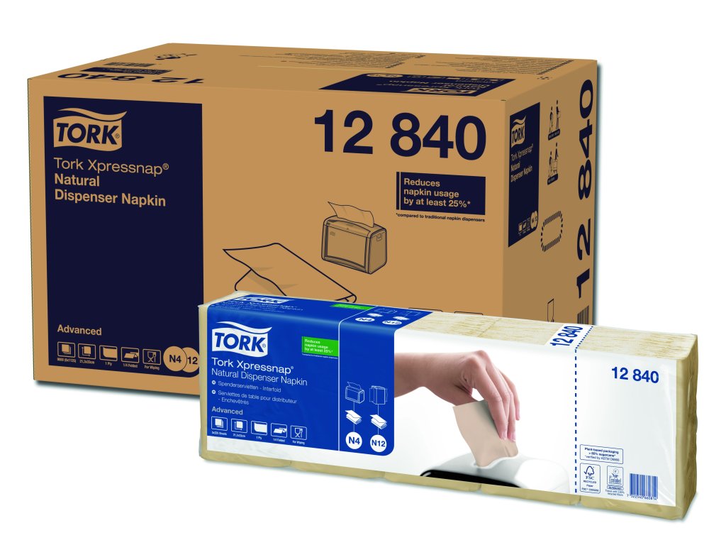 Zásobníky na ubrousky Tork Xpressnap® jsou ideální pro samoobslužné restaurace. Systém vám pomůže snížit spotřebu ubrousků o 25 % v porovnání s tradičními zásobníky na ubrousky. Tork Xpressnap® Natural ubrousky do zásobníku jednovrstvé jsou vyrobeny ze 100% recyklovaných vláken. Jsou proto skvělou volbou, pokud chcete prezentovat svůj závazek k ochraně životního prostředí.