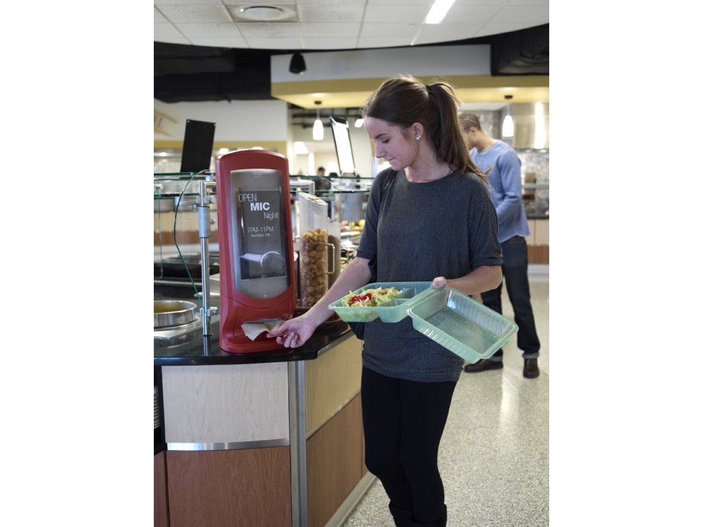 Tork Xpressnap® vysokokapacitní zásobník na ubrousky, ideální pro restaurace s omezenou obsluhou a velkou návštěvností. Tento moderní zásobník dávkuje ubrousky po jednom, zvyšuje hygienu a v porovnání s tradičními zásobníky na ubrousky snižuje spotřebu minimálně o 25 %.