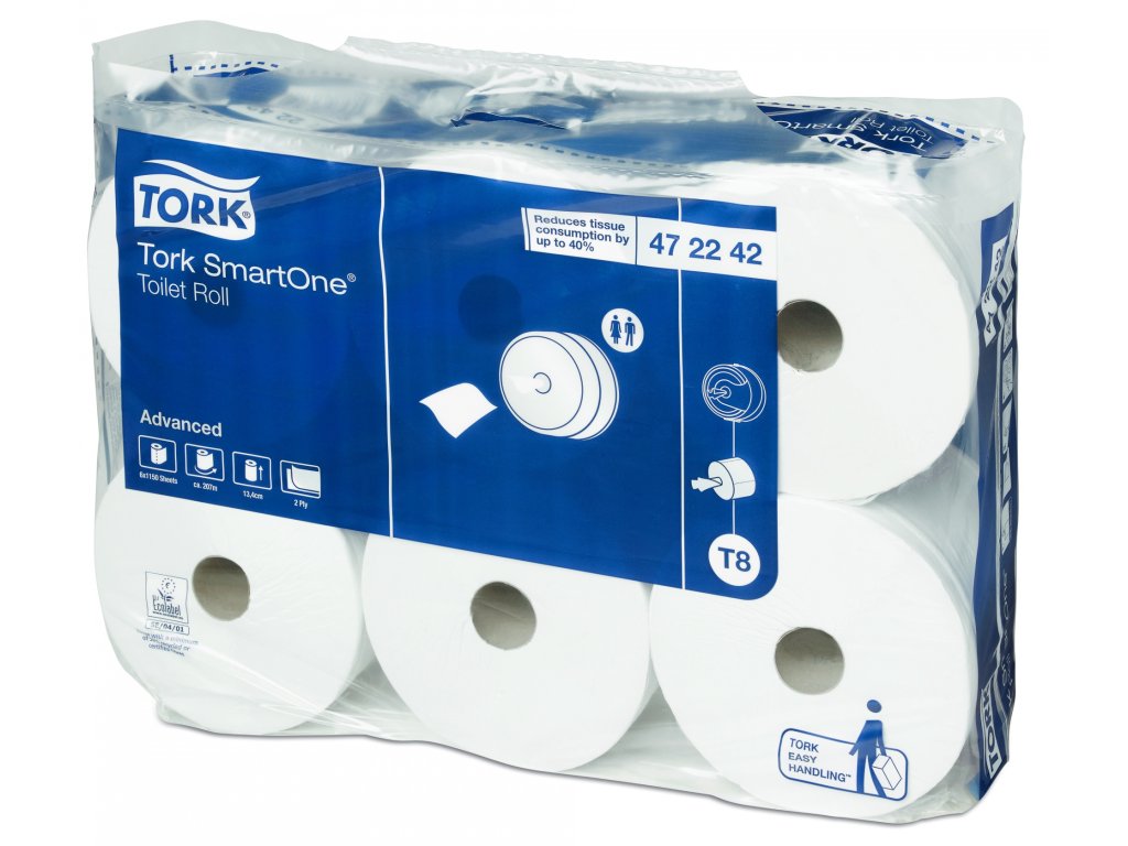 Tork SmartOne® toaletní papír v roli je jedinečný systém s hygienickým výdejem po jednom útržku a v porovnání s tradičními zásobníky na jumbo role snižuje spotřebu až o 40 %. Každá role tak vystačí pro více návštěvníků. Tork SmartOne© role s vysokou kapacitou jsou vhodné do náročných podmínek toalet a umýváren s vysokou návštěvností.