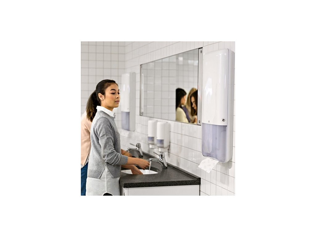 Tork PeakServe®: nejnovější inovace určená pro toalety a umývárny s vysokou návštěvností, kde personál potřebuje maximalizovat dobu věnovanou úklidu a zajistit plynulý tok lidí. Systém kompatibilní s Tork PeakServe® navazujícími papírovými ručníky má velmi vysokou kapacitu více než 2100 ručníků, které se dávkují rychle a bez přerušení, aby zůstal zachován plynulý provoz. Kompresované náplně lze kdykoli rychle doplnit. Snadno se uchovávají a přepravují a umožňují personálu zaměřit se na úklid a nikoli doplňování.