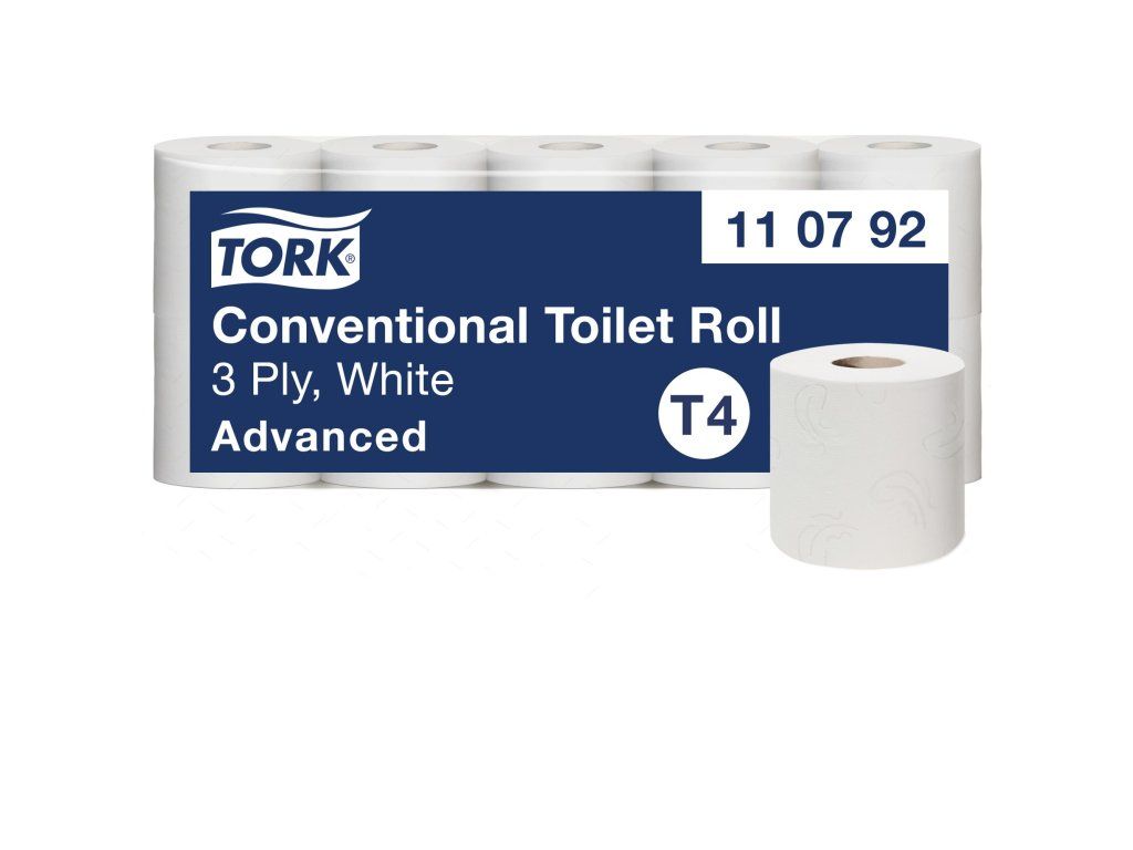 Poskytněte svým hostům toaletní papír Tork v konvenčních rolích v kvalitě Premium, aby se u vás cítili stejně pohodlně jako doma. Tento jemný toaletní papír se vyznačuje prvotřídním vzhledem, je příjemný na omak a na toaletách a v umývárnách s nízkou návštěvností zaručuje odpovídající komfort. Kompatibilní s Tork zásobníky na toaletní papír konvenční role T4.