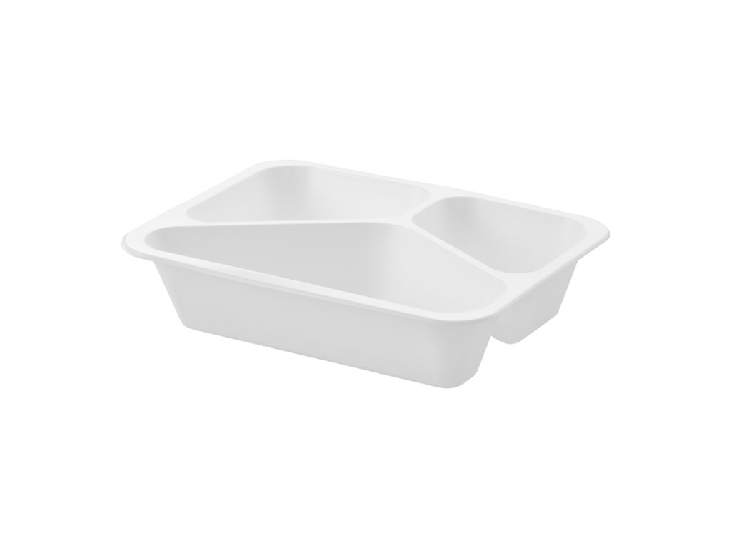 Třídílná uzavíratelná nádoba je praktickým řešením pro servírování a přepravu hlavních jídel s přílohami. Je ideální pro gastronomii, catering a prodejny jídla s sebou.